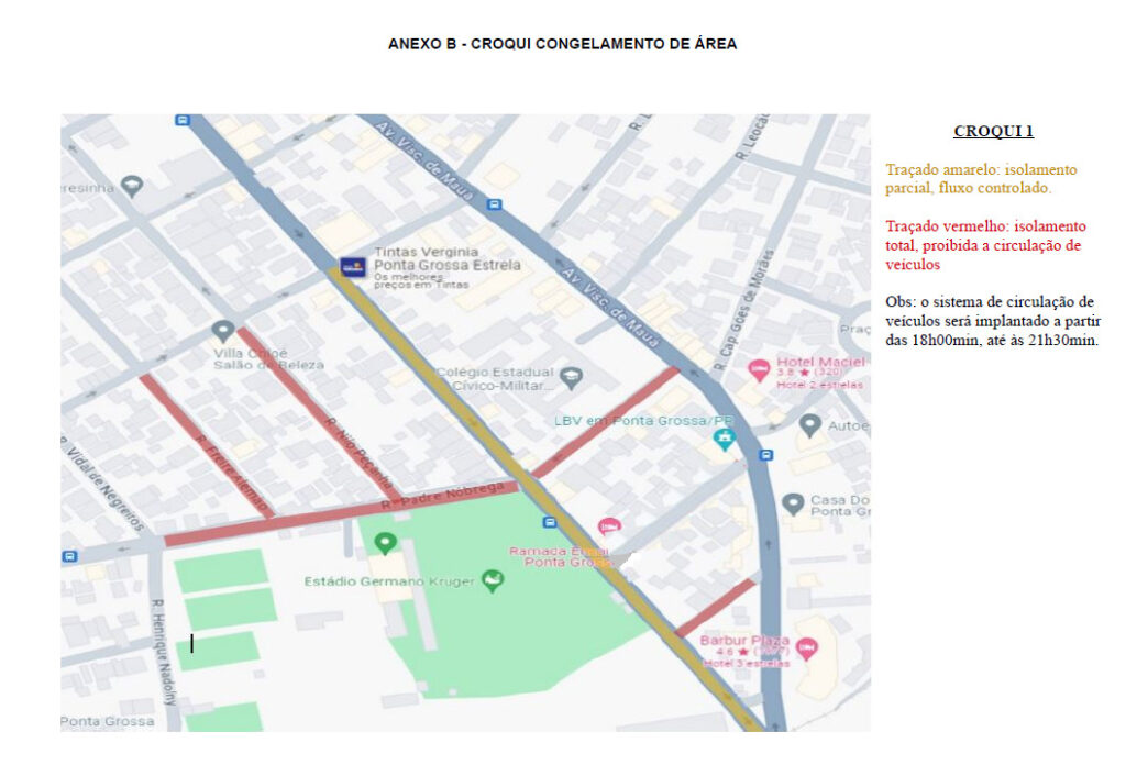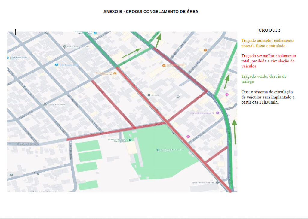 O bloqueio das vias tem início às 18h. A partir desse horário, a Rua Emílio de Menezes (traçado amarelo) terá isolamento parcial, com fluxo de veículos controlado. As ruas Nilo Peçanha, Padre Nóbrega, Freire Alemão e Fernando de Noronha (traçado vermelho) serão isoladas totalmente, sendo proibida a circulação de veículos.