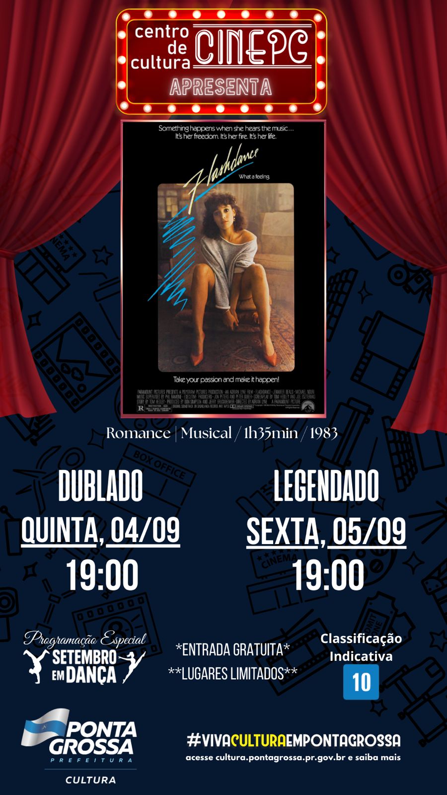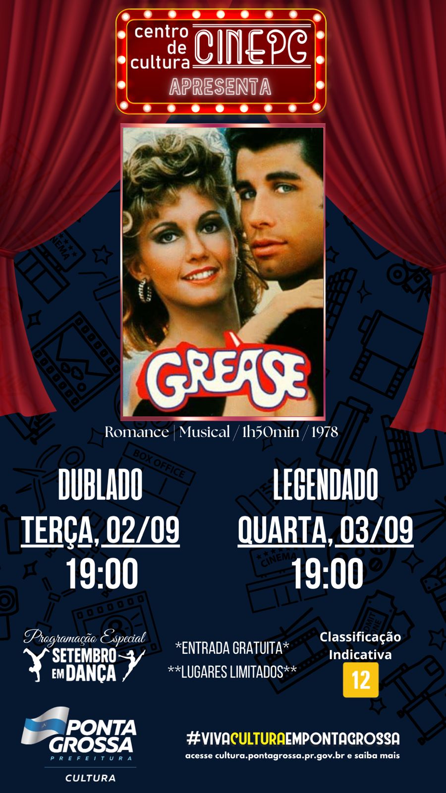 O CinePG traz nesta semana para o público ponta-grossenses dois musicais que marcaram época na história do cinema: Grease – Nos tempos da brilhantina, de 1978 (terça e quarta); e Flashdance, de 1983 (Quinta e sexta). As sessões acontecem sempre a partir das 19h e a entrada é gratuita. A promoção é da Prefeitura de Ponta Grossa, através da Secretaria Municipal de Cultura.