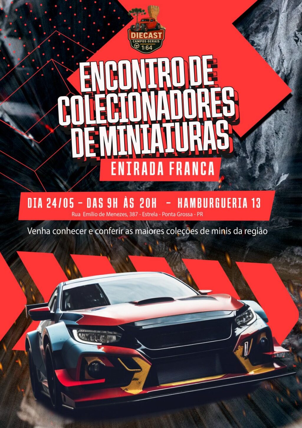 Voltado a entusiastas e colecionadores, o encontro contará com exposições e vendas de miniaturas de veículos em diversas escalas — como 1/64 e 1/43 — além de itens produzidos com impressão 3D, action figures e outros objetos de coleção.