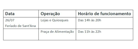 Nesta quarta-feira, 26 de julho, feriado de Sant’Ana, as lojas e os quiosques do Palladium Shopping Center de Ponta Grossa estarão abertos, das 14h às 20 horas. A Praça de Alimentação funcionará das 11h às 22h. O Cinema seguirá a programação do site.