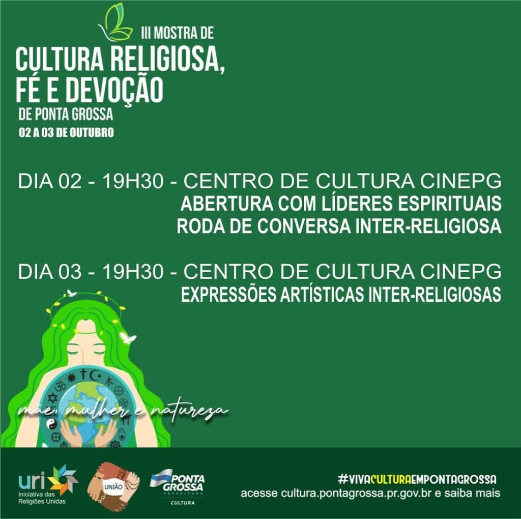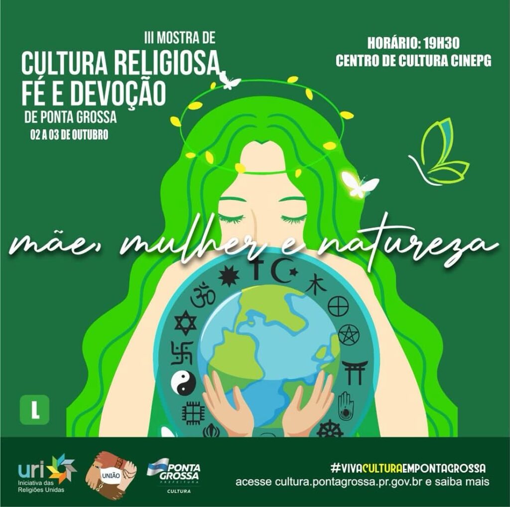 Ponta Grossa recebe nos dias 02 e 03 de outubro a III Mostra de Cultura Religiosa, Fé e Devoção, no Centro de Cultura CINEPG. O evento reúne diferentes tradições espirituais em rodas de conversa, momentos de mística, apresentações culturais e espaços de diálogo inter-religioso, com o tema central “Mãe, Mulher e Natureza”.