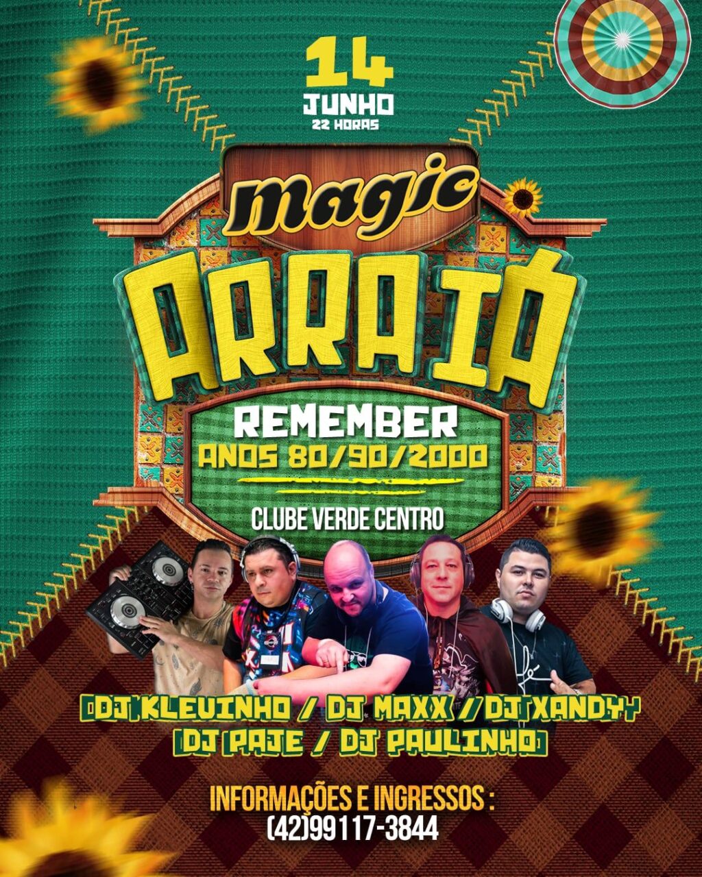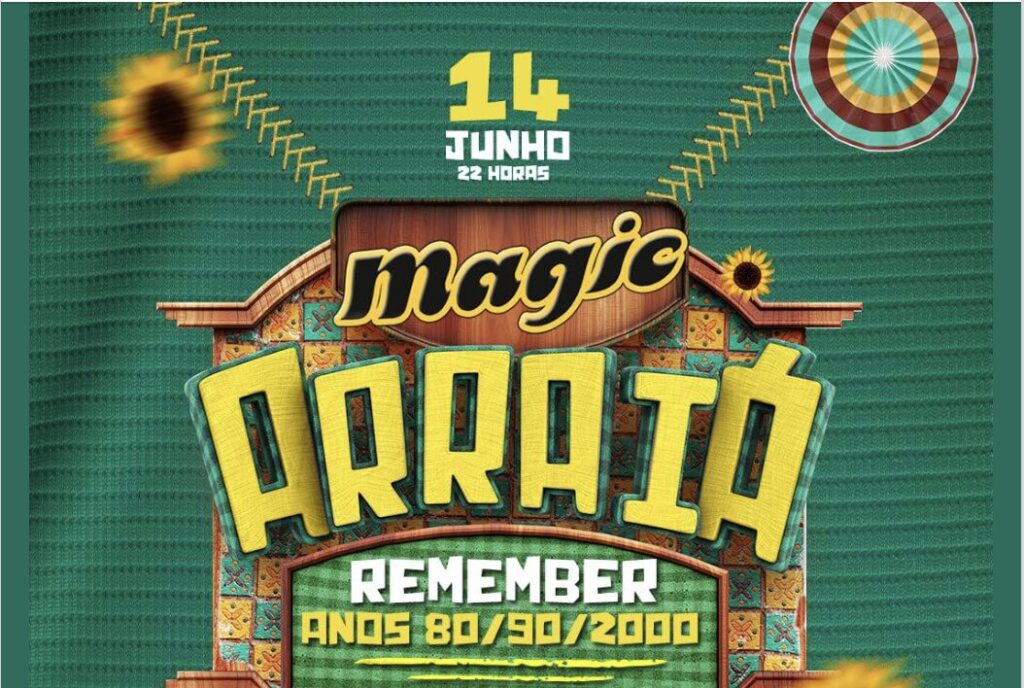 Se você viveu os anos 80, 90 e 2000, ou só queria ter vivido, chegou o seu momento de voltar no tempo com estilo, música boa e muita energia. Vem aí o Magic Arraiá Remember – uma noite que mistura nostalgia, festa junina raiz e batidas que arrepiam. Dia 14 de junho no Clube Verde Centro.
