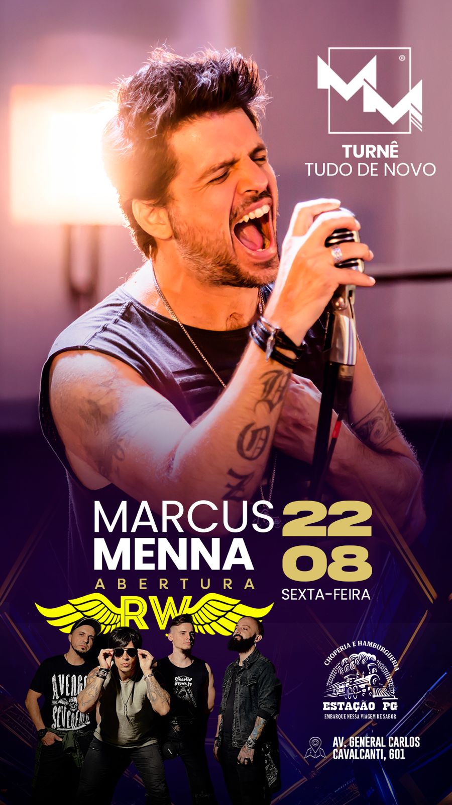 A abertura da noite começa com a banda RW, que sobe ao palco trazendo muito rock e abrindo o show em grande estilo. O Estação PG abre a casa a partir das 17h. O espaço fica na Av. Gen. Carlos Cavalcanti, 601. Mais informações e reservas podem ser feitas pelo telefone (42) 99861-0613.
