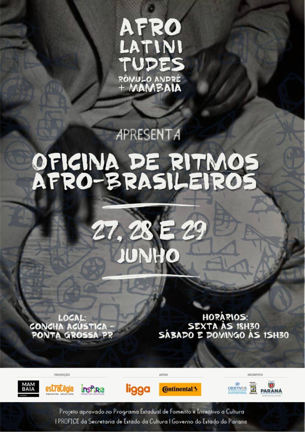 Conhecer, experienciar e praticar diferentes ritmos afro-brasileiros é a proposta de uma série de seis oficinas que serão ministradas gratuitamente por músicos da banda Mambaia nos dias 27, 28 e 29 de junho, na Concha Acústica (Praça Barão do Rio Branco), em Ponta Grossa. A atividade, que compõe o projeto Afrolatinitudes, é viabilizado pelo Programa Estadual de Fomento e Incentivo à Cultura (PROFICE), da Secretaria de Cultura do Paraná, e conta com o apoio da Ligga e Continental.