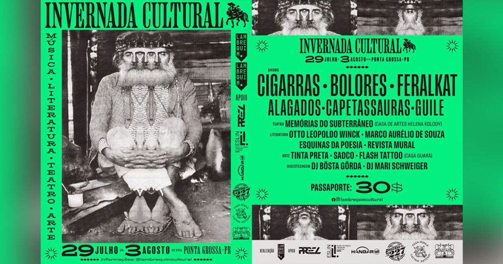Acontece nesta semana, em Ponta Grossa, o festival Invernada Cultural, organizado pelo selo Lambrequim. Serão 4 dias recheados de atrações, passando por diversos espaços da cidade. Contando com teatro, lançamentos literários, palestras, oficinas, exposições de arte e muita música boa, a programação se inicia na segunda-feira, 29/07, e segue até sábado, 03/08.