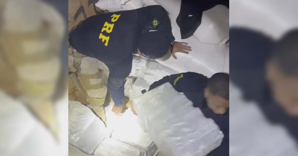 Ao fiscalizar de forma minuciosa foram encontrados, em meio aos sacos de arroz, vários sacos contendo maconha, sendo contabilizados 1.803,46 kg da droga em forma de tabletes.