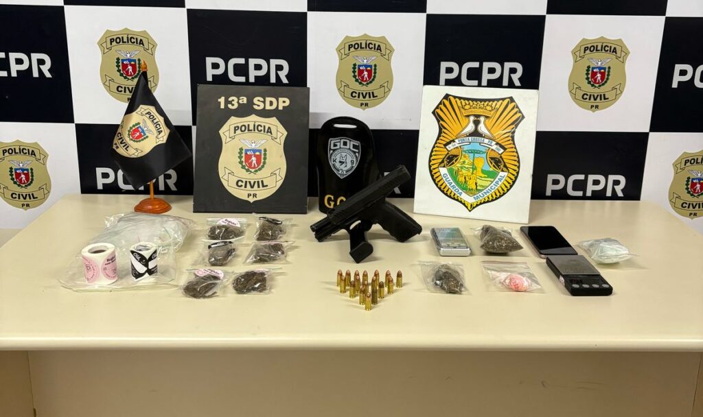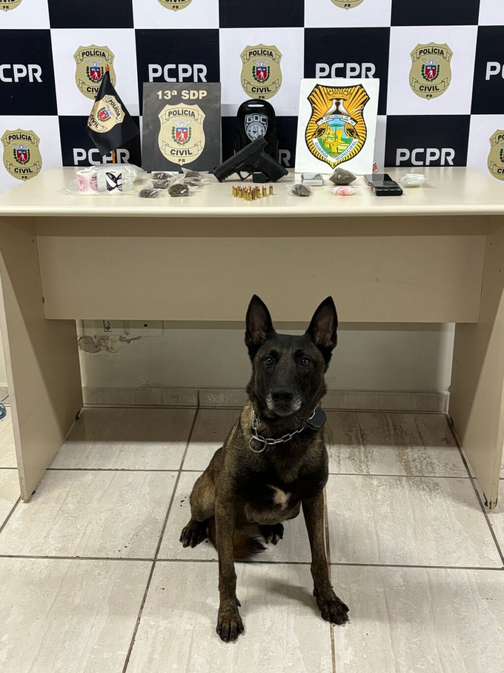 Com o auxílio do cão farejador “Bolt”, os agentes localizaram porções de maconha e cocaína, balanças de precisão e materiais utilizados para embalar drogas. Durante as buscas, também foi apreendida uma pistola calibre 9 mm da marca Taurus, com a numeração de série raspada, em posse do principal alvo da operação.