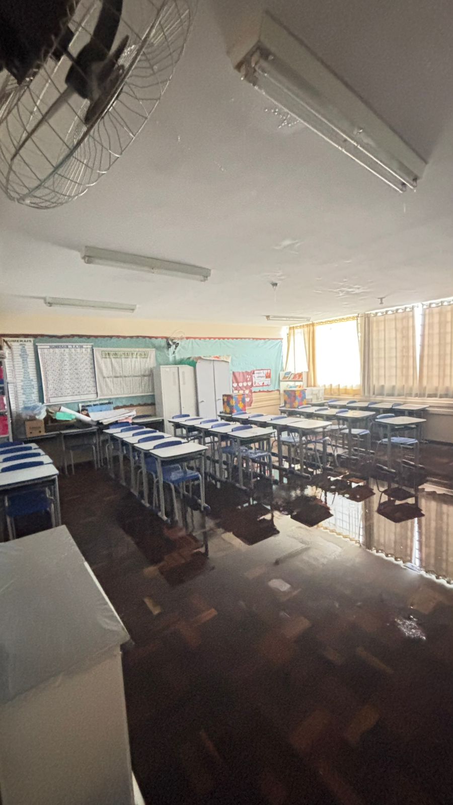 Entre os locais atingidos pelas fortes chuvas, está a Escola Municipal José Pinto Rosas, onde a cobertura de uma quadra de esportes desabou, causando danos no prédio. Diante disso, a Defesa Civil interditou o imóvel.