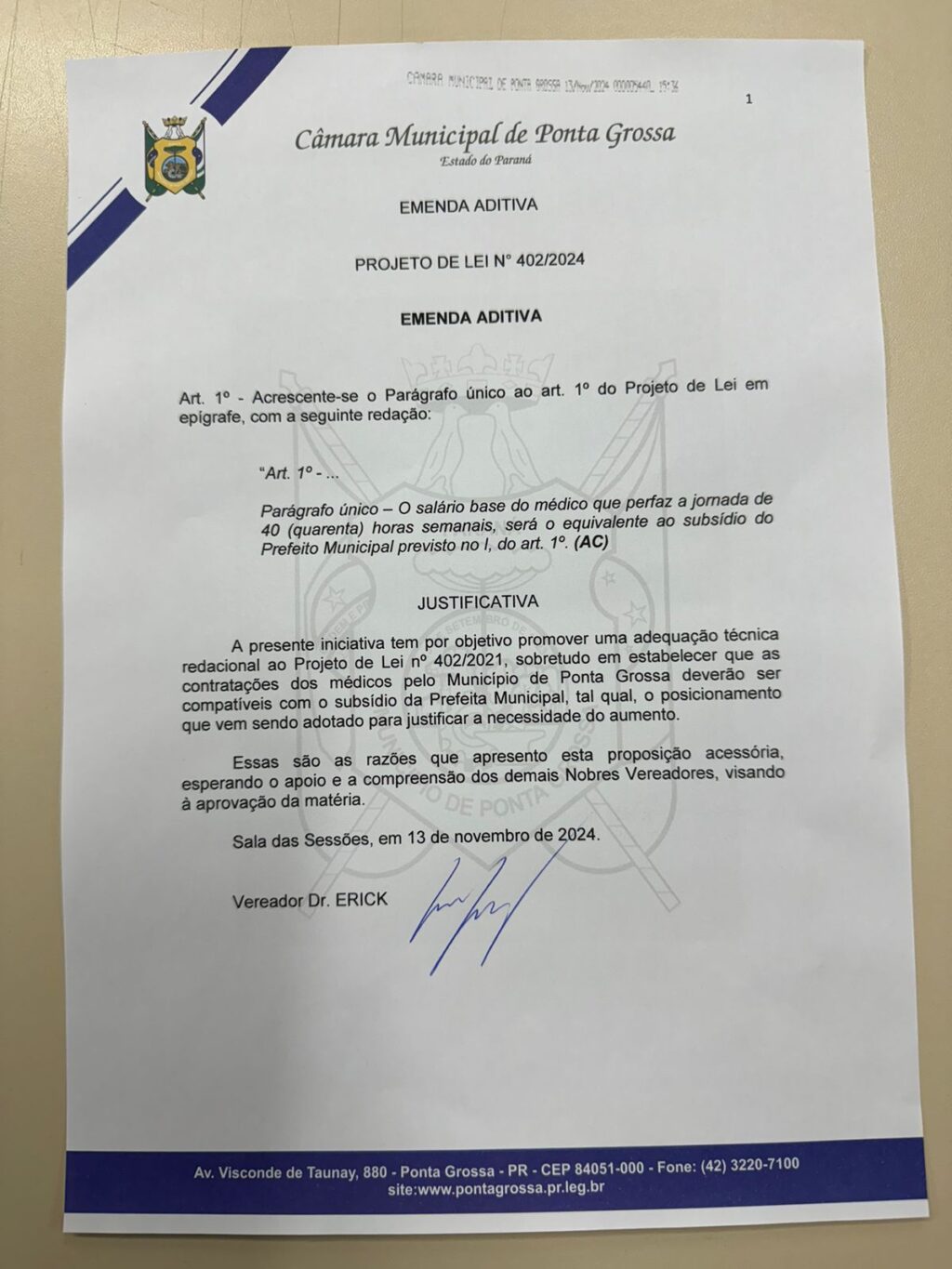 O vereador Dr. Erick (PV) protocolou ontem uma emenda ao projeto de lei que propõe o aumento do subsídio da prefeita de Ponta Grossa. Segundo o parlamentar, a justificativa do Poder Executivo para o reajuste seria a equiparação com os salários de médicos que trabalham 40 horas semanais, que atualmente recebem R$ 13 mil, enquanto o teto salarial da prefeita é de R$ 20 mil.